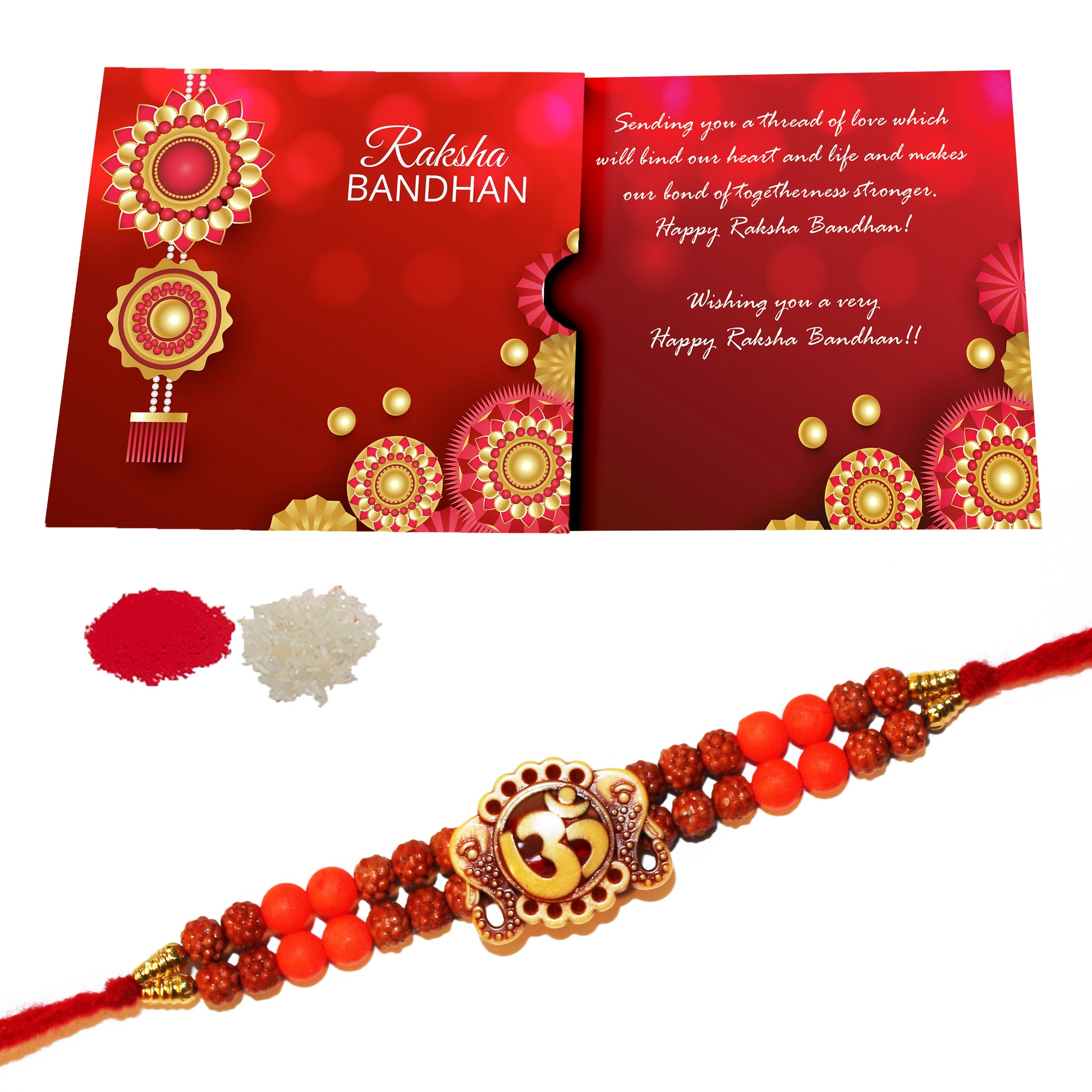 Raksha Bandhan, also Rakshabandhan, is a popular, traditionally Hindu, annual rite, or ceremony, which is central to a festival of the same name, celebrated in India, Nepal and other parts of the Indian subcontinent, and among people around the world influenced by Hindu culture. On this day, sisters of all ages tie a talisman, or amulet, called the rakhi, around the wrists of their brothers, symbolically protecting them, receiving a gift in return, and traditionally investing the brothers with a share of the responsibility of their potential care. This packet contains 2 Rudraksh Rakhi, 1 greeting card & roli chawal pack.